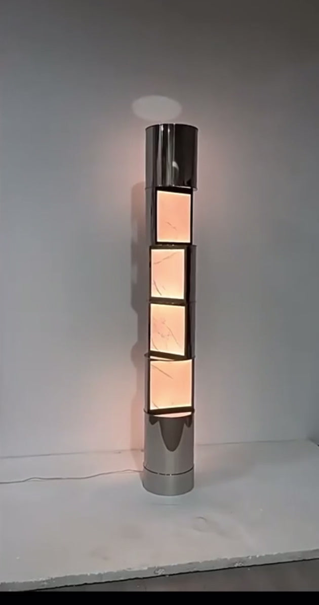 Crafted for connoisseurs of luxury design, our Modern Stainless Steel Floor Lamp serves as a beacon of sophistication. Its towering form and harmonious blend of marbled glass and metal transcend mere functionality, establishing this piece as an emblem of high-end decor and a striking example of modern stainless steel craftsmanship. The six marbled glass faces offer a modern twist on classic elegance, emitting a soft, ambient glow reminiscent of a marble effect LED fixture. This design element allows it to seamlessly integrate into a variety of decor styles, from the sleek lines of Minimalism to the opulent touches of Hollywood Regency and the dynamic edges of Art Deco.