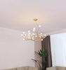 This tree-branch-inspired chandelier makes a sophisticated statement of organic beauty and modern design, bringing the tranquility of nature indoors. Crafted from a harmonious blend of natural wood and metal, this striking centerpiece imbues any space with both elegance and a grounded, earthy feel. The design features gracefully curved branches, each adorned with a clear glass globe, creating a soft, ambient glow perfect for transforming living or dining areas into serene retreats. A luxurious gold leaf finish adds a touch of opulence, while metallic leaves seemingly burst forth from the fixture, evoking the image of a blossoming tree. This unique tree branch ceiling light seamlessly integrates into biophilic or rustic décor schemes, adding an element of natural artistry.