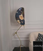 The base is solid stainless steel and the diffuser is a reinforced botanical-patterned fabric designed for soft, even illumination.